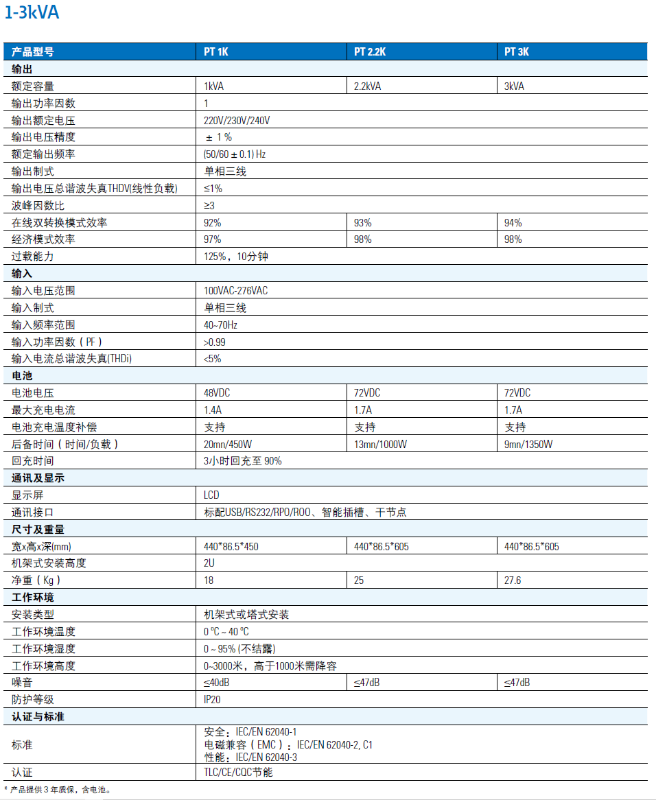 全系列采用有源功率因数校正技术,对电网无污染。低噪音设计,1-3kVA噪音低于40dB达到办公环境的标准。电路板防尘防腐喷漆工艺,适应更恶劣的环境应用。50度高温环境测试,拓展应用场景。多种输入输出配置方式,可根据现场实际情况调整输入输出为单相或者三相。机架式安装或塔式安装随意转换。