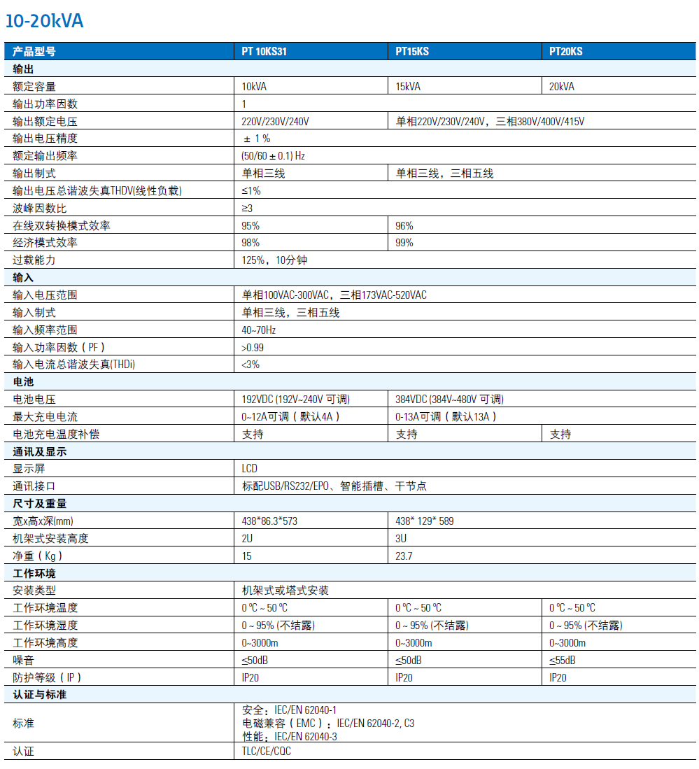 更高的效率,更小的体积。全系列输出功率因数为1,10kVA双转换模式效率高达95%,机架式安装时高度2U,深度小于600mm。